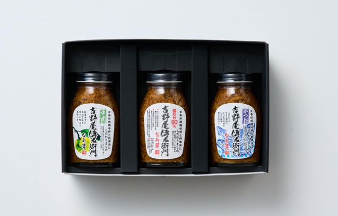 傳右衛門のなめ茸3種類の味が楽しめる『楽(たのしみ)』セットです。ギフトにオススメです!